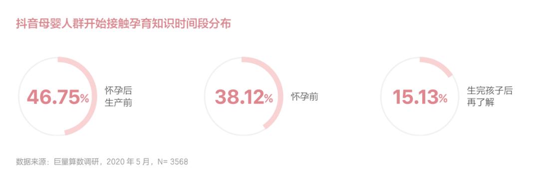 其次,由于母婴人群学历提升、消费升级,每个家庭在育儿过程中的明显变化是既注重“养”,也注重“育”。据抖音母婴人群调研数据,约 85% 的母婴人群在怀孕前和孕期就已经开始了解和接触孕产、育儿知识。也因此从资讯信息获取环节,母婴人群就已经开始了“种草”,其消费决策会受到资讯信息的潜在影响。