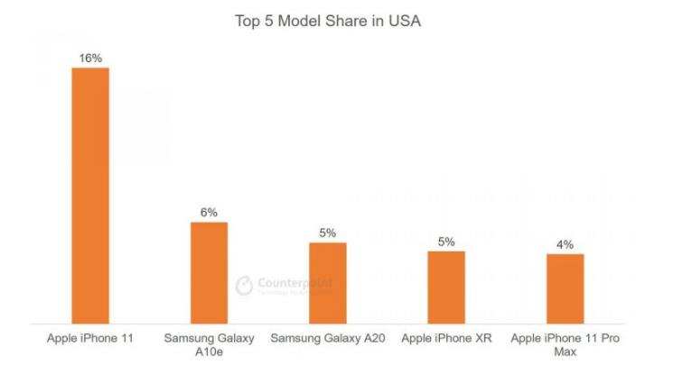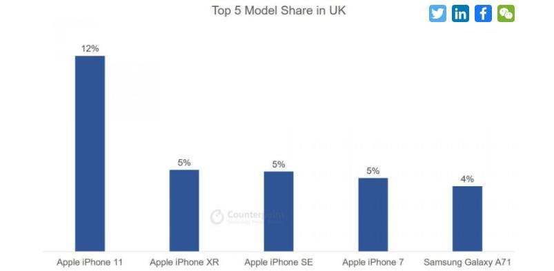 Counterpoint Research的报告里还提及了其他国家数据。其中,在美国、英国、德国、日本这些发达国家,iPhone11的份额都是第一位,三星的机型也偶尔上榜。