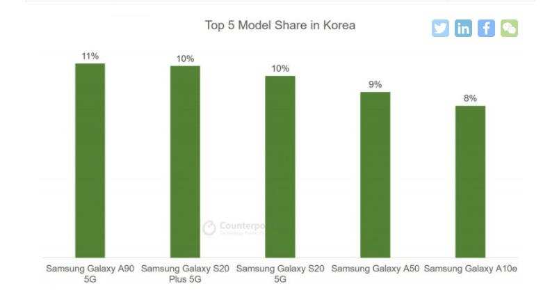 韩国市场Q2各手机所占份额 图片来自于Counterpoint Research