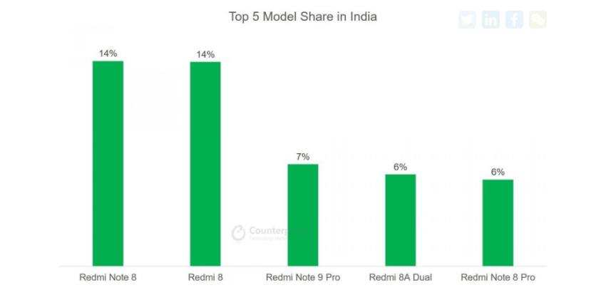 在韩国,本土品牌三星的机型则大包大揽了前五名。在印度,Redmi的五款机型分别占据了榜单的前五位(Redmi Note 8、Redmi 8、Redmi Note 9 Pro、Redmi 8A Dual、Redmi Note 8 Pro)。