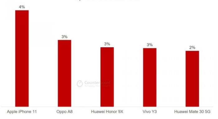 首先,为什么上榜的是Mate30而不是P40,为什么Mate30的市占率只有iPhone11的一半?