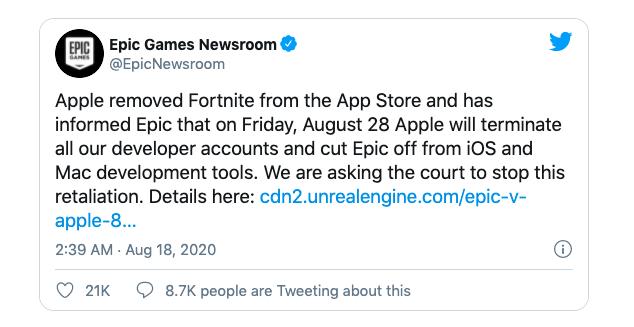 当地时间 8 月 17 日,Epic Games 公司在社交媒体上表示:苹果已将《堡垒之夜(Fortnite)》游戏从 App Store 应用商店中移除,并告知将于 8 月 28 日终止 Epic 所有开发者账号,并撤销 Epic 对 iOS 和 Mac 开发者工具的访问权限。