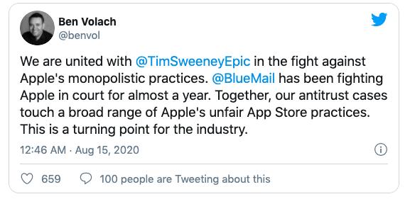 “ 我们与 @TimSweeneyEpic 站在一边,共同反对苹果的垄断行为。 @BlueMail 一直在法庭与苹果抗争。我们的反垄断诉讼针对苹果在 App Store 中实施的一系列不公平行为。这将成为软件行业的一大转折点。 ”