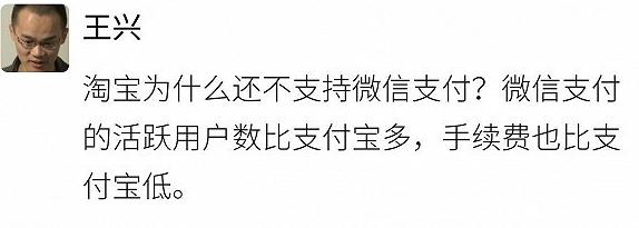 从不嫌事大的美团CEO王兴则在饭否炮轰:“淘宝为什么还不支持微信支付?微信支付的活跃用户数比支付宝多,手续费也比支付宝低。”