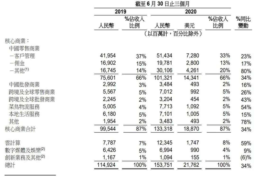 对阿里财报而言,外界最为关注的永远是核心业务电商。截至2020年6月,中国零售市场移动月活跃用户较2020年3月增长2800万,至8.74亿。有媒体就据称计算称,13亿中国人中,每3个中国人中就有2个中国人在使用淘宝或支付宝等阿里巴巴旗下的APP。