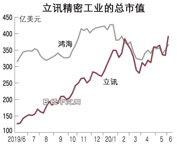 2020年6月,立讯精密市值已经超过富士康母公司鸿海。截至7月20日收盘立讯市值达到3889亿元,比富士康(工业富联)的3038亿元高出28%。