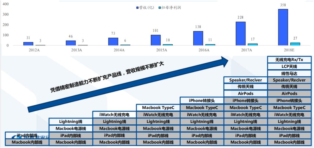 就以立讯精密为例,过去十几年,公司完成了从单品到多品的扩展;今年7月还成为了大陆首家iPhone代工厂,从富士康小跟班成为了富士康“备胎”。
