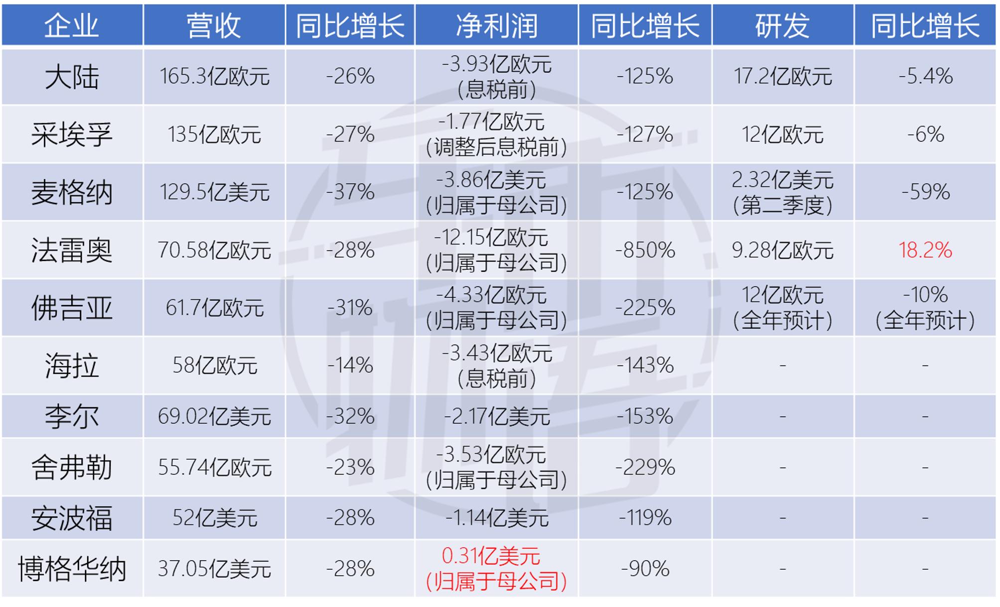 车市物语梳理了10家主流跨国零部件企业的半年报,其营收全线下跌,平均降幅达25%以上,净利润为负的企业占9家,平均下跌超200%。