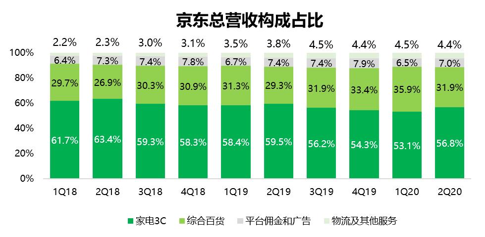 事实上,在京东最开始起步的阶段,3C和家电一直都是京东的特色和标签,这一点我们从京东的收入构成上也可以窥视一般。财报数据显示,家电3C的产品销售收入占京东总营收的比重一直超过半数,尽管这一比例呈总体下降的趋势(56.8%,2Q20 vs 63.4%,2Q18),但仍然是京东最主要的收入来源。