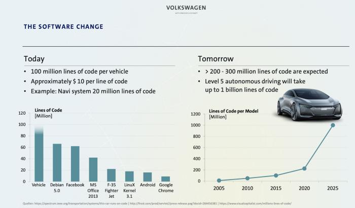“随着电子和软件的重要性在不断增加,复杂性也在增长。就以现代汽车所包含的爆发式性的软件代码行数(SLOC)为例吧。2010年的时候,部分车型的SLOC约为一千万行;到2016年时,这一数字增长了15倍,达到约1.5亿行。滚雪球般的复杂性正在导致与软件相关的重大质量问题,最近数百万次的汽车召回就证明了这一点。