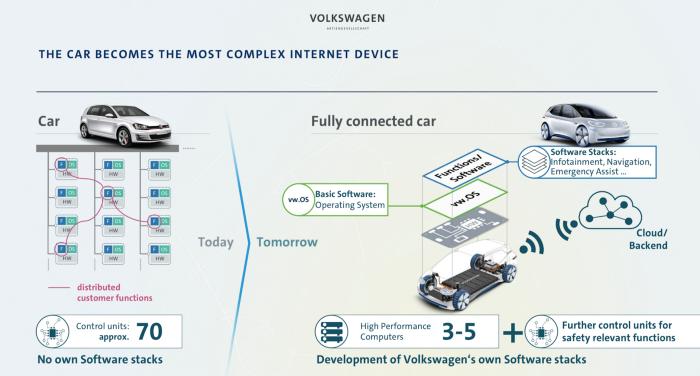 一年前,Diess 在给金融界进行的一次演讲里面概要介绍了该汽车制造商的软件战略,它的名字叫做Car.software ,其中明确提到了大众要开发类似于OS的技术栈,正如以下两张片子所示: