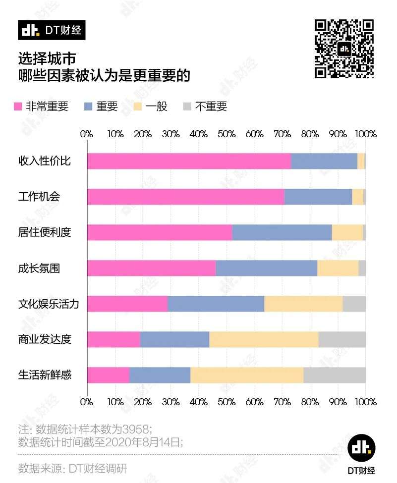 其次,一座城市的居住便利度和成长氛围也拿到了超过8成受访者的投票。得分最低的则是生活新鲜感,认为这一因素重要的受访者不足4成。