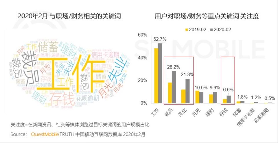 QuestMobile数据显示,今年2月份,人们在浏览新闻资讯和社交媒体时,对“裁员”、“失业”等职场相关关键词的关注度相比去年显著提升。根据计算,浏览过这类关键词的用户规模占比分别达到28.2%和21.3%,对“工作”这一关键词的关注度也上升到52.7%。