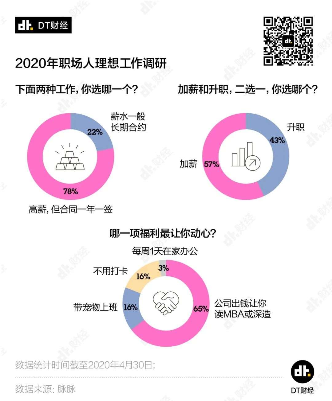对未来可能长时间失业、收入下降的担忧,让年轻人对于工作的看法不再潇洒。脉脉的调研数据显示,职场人对于理想工作的期待更加现实。比如相比升职更希望加薪、各种福利中最青睐公司出钱深造、合同可以一年一签只要高薪就好等等。