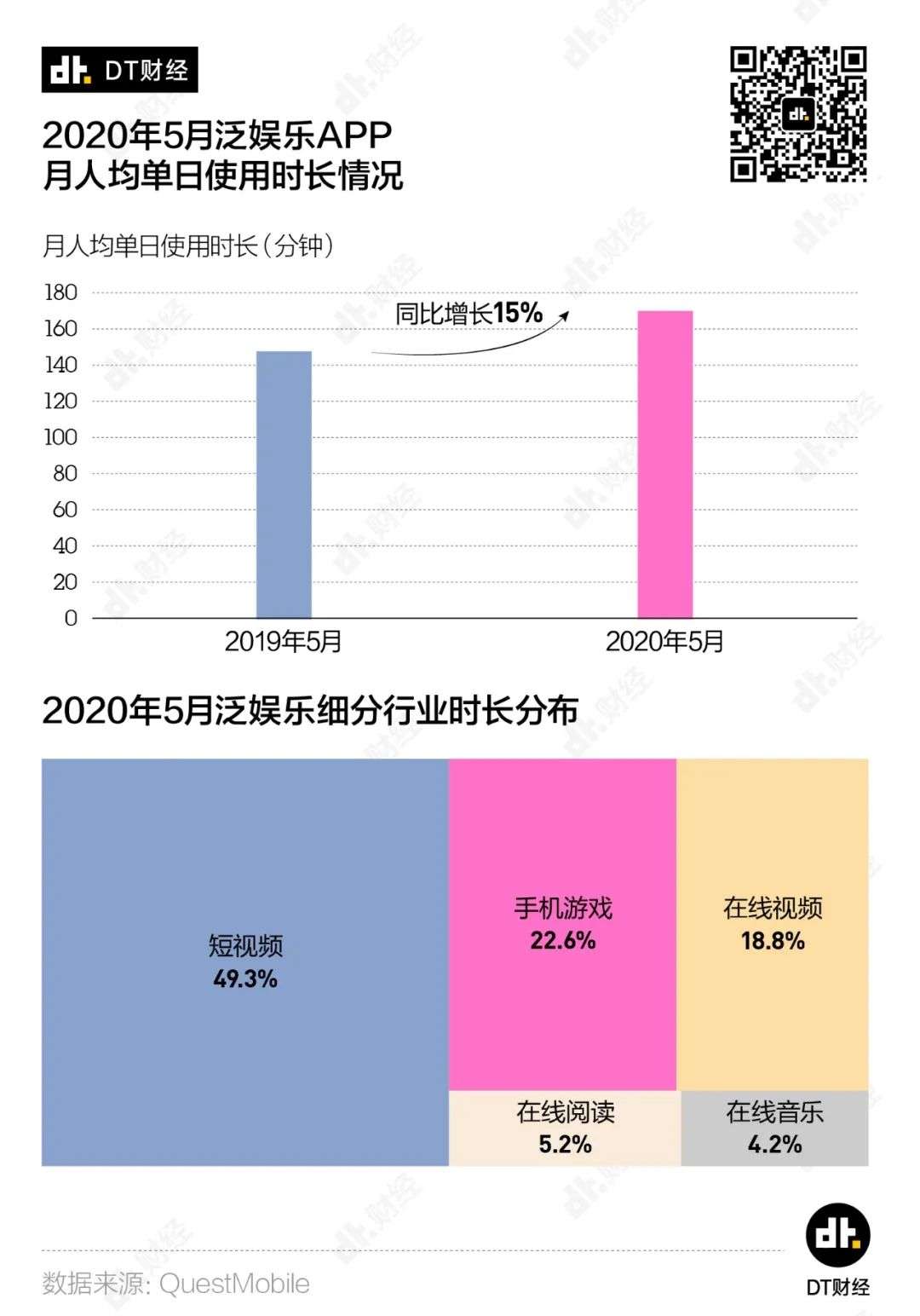 仔细想想,其实看视频、玩手游、刷社交软件,这些线上娱乐方式已经成为很多人的快乐源泉。QuestMobile数据显示,2020年5月,泛娱乐APP的每天人均使用时长达到了171分钟,接近3个小时,同比增长了15%。