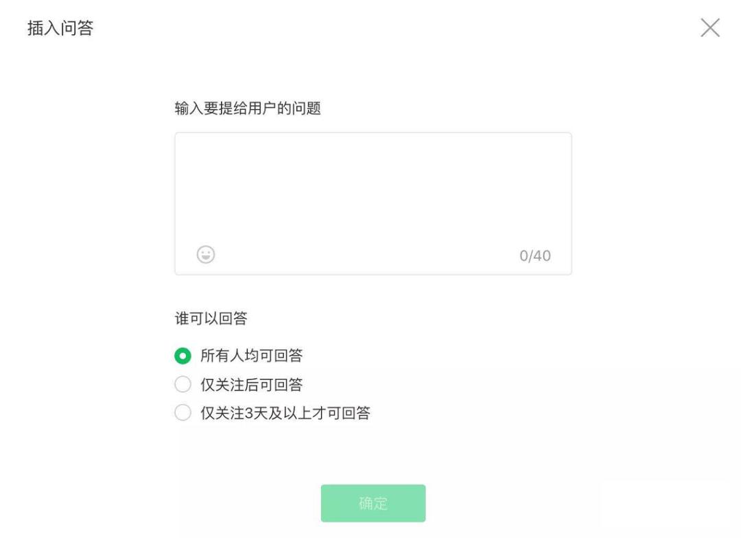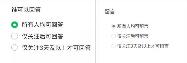 此外,“问答”同样可以设置回答问题的对象,包括“所有人均可回答”、“仅关注后可回答”以及“仅关注3天以上才可回答”。