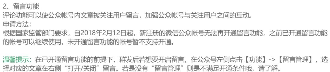 微信留言功能,曾在2017年底与原创功能一起向所有公众号开放,大大降低了公众号创作的门槛。但是,不到半年时间,2018年3月,在国家监管部门的要求下,微信重新限制留言功能。在过去 3 个月注册、但未使用留言功能的账号被收回了留言功能。新注册的公众号,不再开放留言功能。