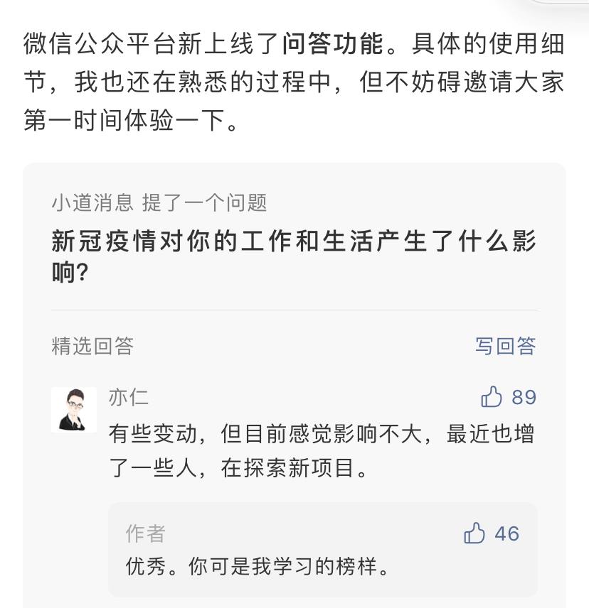 微信公众号今年的小更新有点多。就在前天,公众号又上线了一个新功能——问答,目前还在内测中。