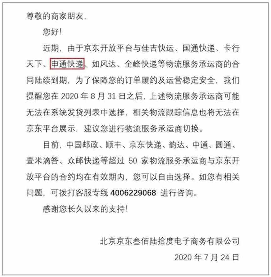 事件开始于7月底,在京东商家论坛上,管理员发了一个公告,称由于京东开放平台与申通快递、如风达、全峰快递、佳吉快运、国通快递、卡行天下等合同陆续到期,2020年8月31日之后,上述物流服务承运商将无法在系统发货列表上被商家勾选,建议商家及时切换快递供应商,以免影响正常发货。