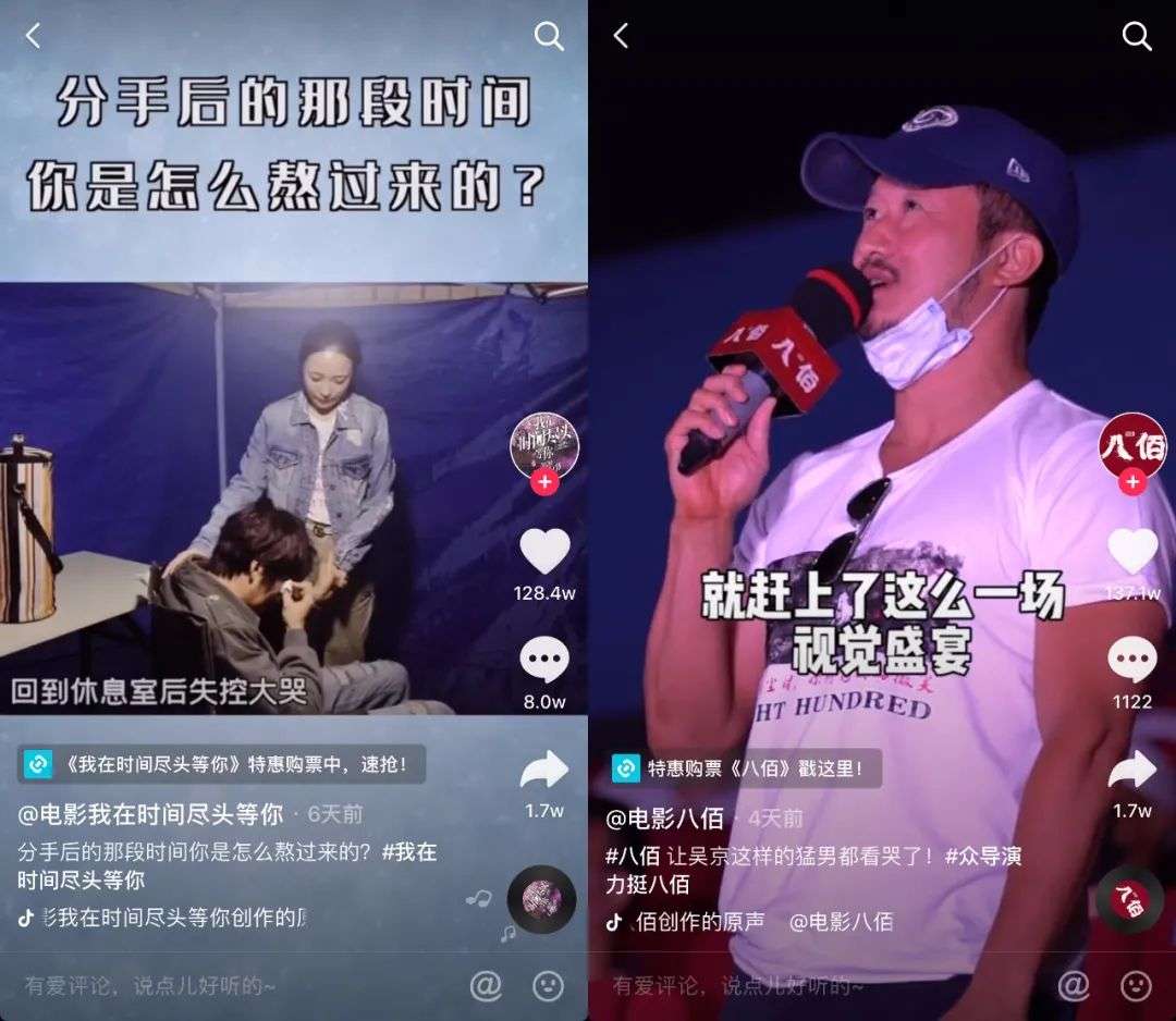 电影方面,《我在时间尽头等你》利用“海报彩蛋”、金句集锦以及名场面等预告片段、《八佰》则在抖音推出#真实的八佰#、#看八佰哭湿口罩#等话题,同时借助多个影视KOL账号联动传播,相关视频基本都达到数十万到百万的点赞量,目前八佰官方账号粉丝已超过110万。
