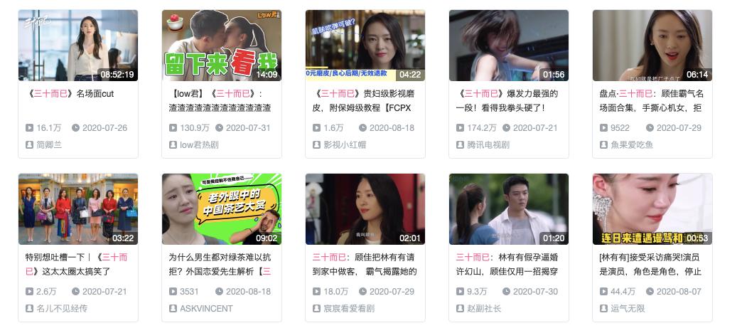 除了抖音、快手,B站、西瓜视频上也有类似的影视视频,基于平台属性不同,相比原片搬运、名场面合集等形式,B站的用户更爱看UP主解说吐槽内容。以《三十而已》为例,UP主解读的视频,播放量普遍高于搬运视频,而且基于剧本身的话题度足够强大,使得UP主解读此剧的播放量远高于其他作品。