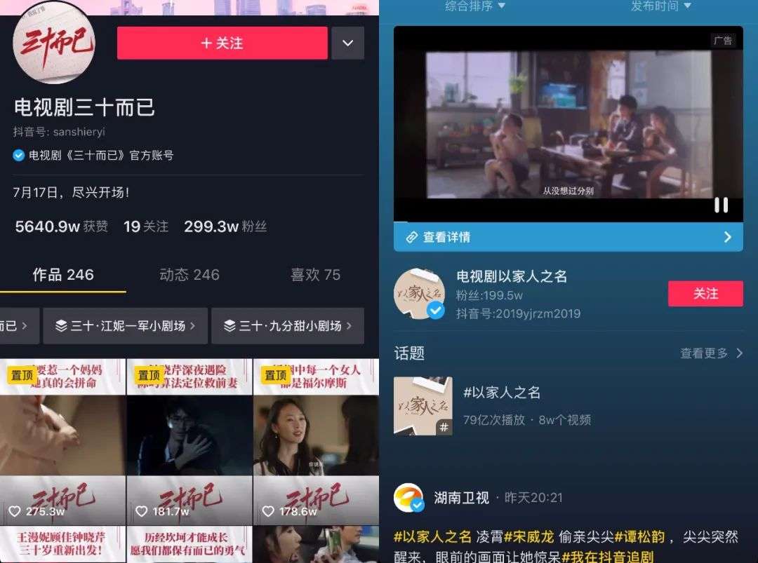 比如热播剧《以家人之名》抖音官方账号会逐步推出“家人·干一杯”、“家人·上硬菜”、“添油家醋小剧场”等多个栏目合集,《三十而已》则推出“三十·细品有味而已”、“三十·九分甜小剧场”等多个栏目合集,将名场面进行分类整理,帮助观众了解剧集,再利用平台的算法推荐,进一步渗透到更多垂类圈层。