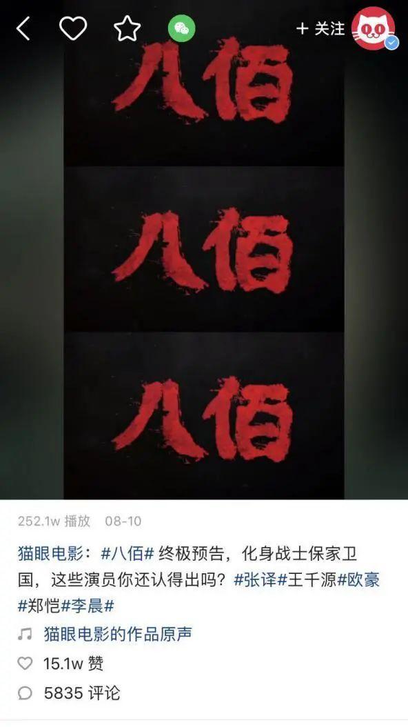 最近热映的电影《八佰》,在抖音上发布的内容则深入剧情探索,不少KOL在平台上对电影进行多方面解读,既引起潜在受众对电影的兴趣进而观影,也让看过电影的人产生共鸣,对其展开更多话题讨论。