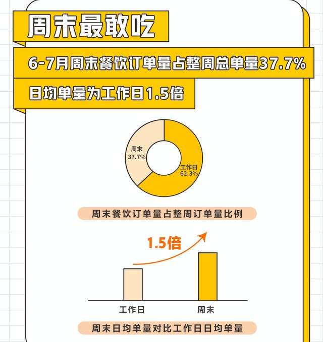 美团点评餐饮学院发布的《2020周末餐饮堂食消费趋势洞察》报告也揭示了周末消费场景的潜力:美团6-7月线上美食搜索热度中,周末的搜索热度较工作日高出27%;周末餐饮线上订单量占整周总单量的37.7%,日均单量为工作日的1.5倍。