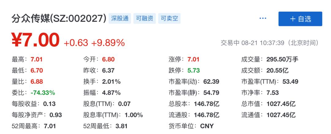 时至今日,8月20日,“中国传媒第一股”分众传媒发布2020年半年度报告,公告显示,公司实现营业收入46.11亿元,同比减少19.35%;实现归属于母公司股东的净利润8.23亿元,同比增长5.85%。受利好消息影响,今日分众传媒开盘涨停,总市值超过1000亿元人民币。