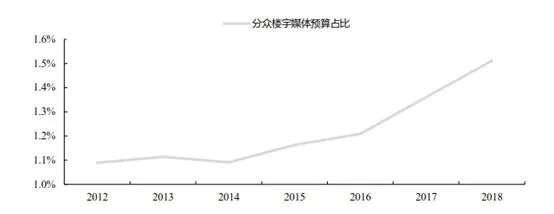 拥有这些特性,在宏观经济整体下滑的情况下,广告主在分众楼宇媒体投入的预算比重占其全部预算的比例还是在逐年提高:从2012年的1.09%提高至2018年的1.51%,2019年上半年广告大盘整体下滑8.8%,传统媒介下滑12.8%(CTR数据)的背景下,传统广告主在分众上的投放还增长了6.08%,充分体现了楼宇媒介的地位在增强。