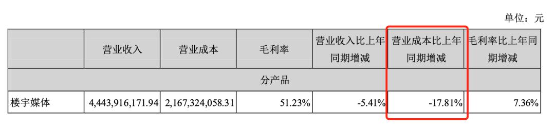 而从成本角度来看,报告期内企业投入总成本比去年同期减少10.48亿元,降幅超过30%。其中楼宇媒体营业成本下降了17.81%,但令人惊喜的是减少了部分的成本支出后毛利率却提高了7.36%。