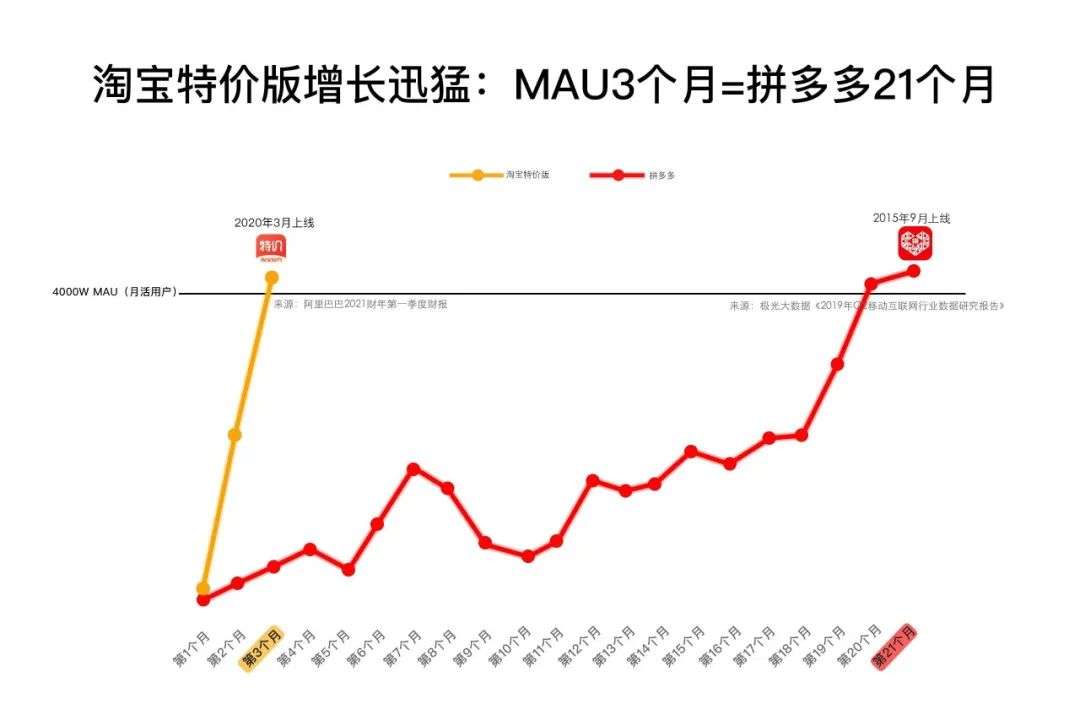 根据昨天阿里巴巴最新的财报,淘宝特价版移动月活跃用户(MAU)达到约4000万,这距离其推出新版本还不到100天。其增长速度极快。