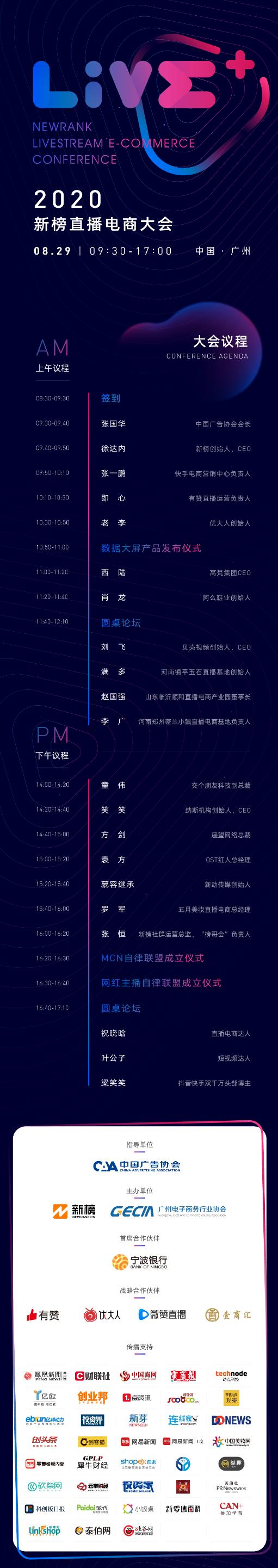 新榜希望携手更多合作活动,以不同的行业角色,通过丰富的展示方式,为整个行业贡献专业力量。 为了加速和规范直播电商行业发展,新榜携手中国广告协会、广州电子商务协会于8月29日在广州共同举办2020新榜直播电商大会,届时将联合直播平台方、广州市商务局、广州市市场质量监督局、广州100家MCN机构代表、广州网红主播代表分别成立MCN自律联盟、网红主播自律联盟,现场同时汇聚直播电商领域一线操盘手及行业专家,解析直播电商新政策和实战打法,并依靠新榜的行业资源以及媒体属性,形成更大势能,合力拥抱新经济。