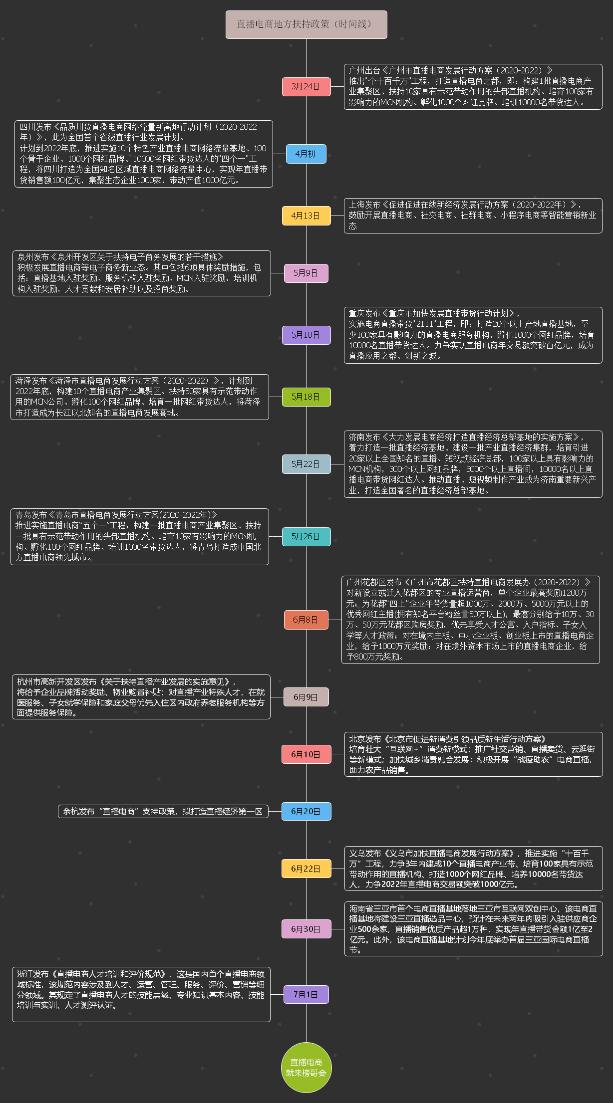 6月22日,杭州余杭区发布《余杭区直播电商政策》,规定电商主播可享受人才政策、为直播电商产业提供专项资金等,如,给予直播电商孵化载体每年最高500万元补助奖励,对MCN机构独家签约年带货销售额5亿元以上顶级头部主播给予500万元奖励。一时间引发热议。 最早在今年3月,广州市出台《广州市直播电商发展行动方案(2020-2022年)》,率先提出打造“直播电商之都”,计划培养1万名直播带货达人。 据不完全统计,今年以来,全国至少11地出台了直播电商相关产业扶持政策,可谓利好不断。