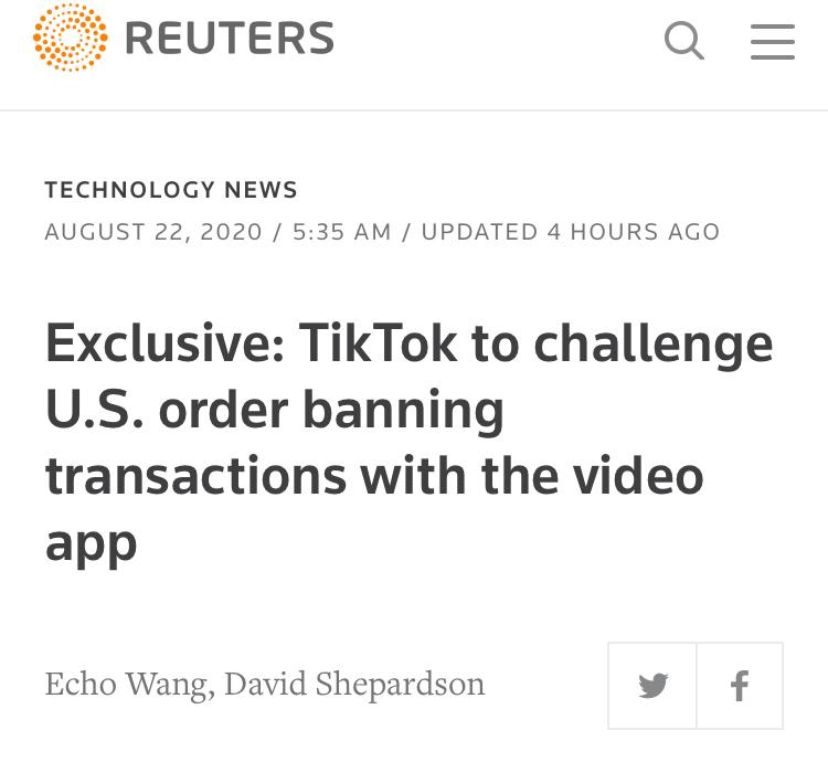 据路透社报道,TikTok正在计划对特朗普于8月6日颁布的第一道行政令提起诉讼,这道行政令禁止美国任何个人和企业于TikTok及其中国 母公司字节跳动进行交易。TikTok认为,这项行政令立足于《国际紧急经济权利法》,没有走正当程序,也反对被归类为“国家安全威胁”。