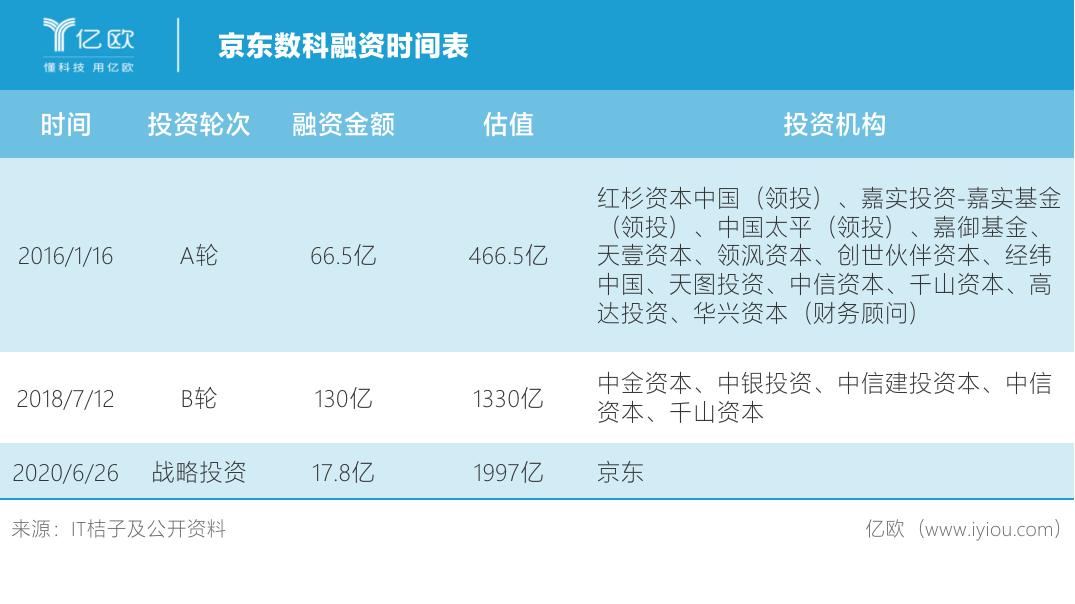 IT桔子的数据显示,京东数科自2013年7月成立之后共进行过3轮融资,2018年7月B轮融资时的估值就高达1330亿元。