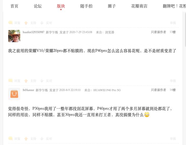 ▲华为论坛中,有用户反映 P40 Pro 的屏幕不耐磨