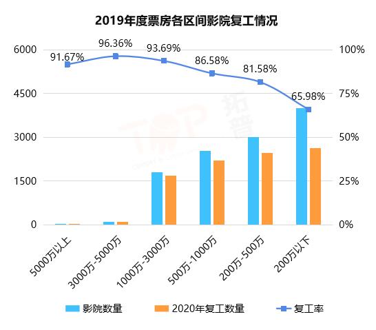若以影院规模作为筛选标准,则会发现,2019年票房在3000万-5000万之间的影院复工率为96.36%,是目前最高;除了票房在200万以下的影院复工率为65.98%,低于全国平均值之外,其他票房区间的影院复工率基本超过了81%。