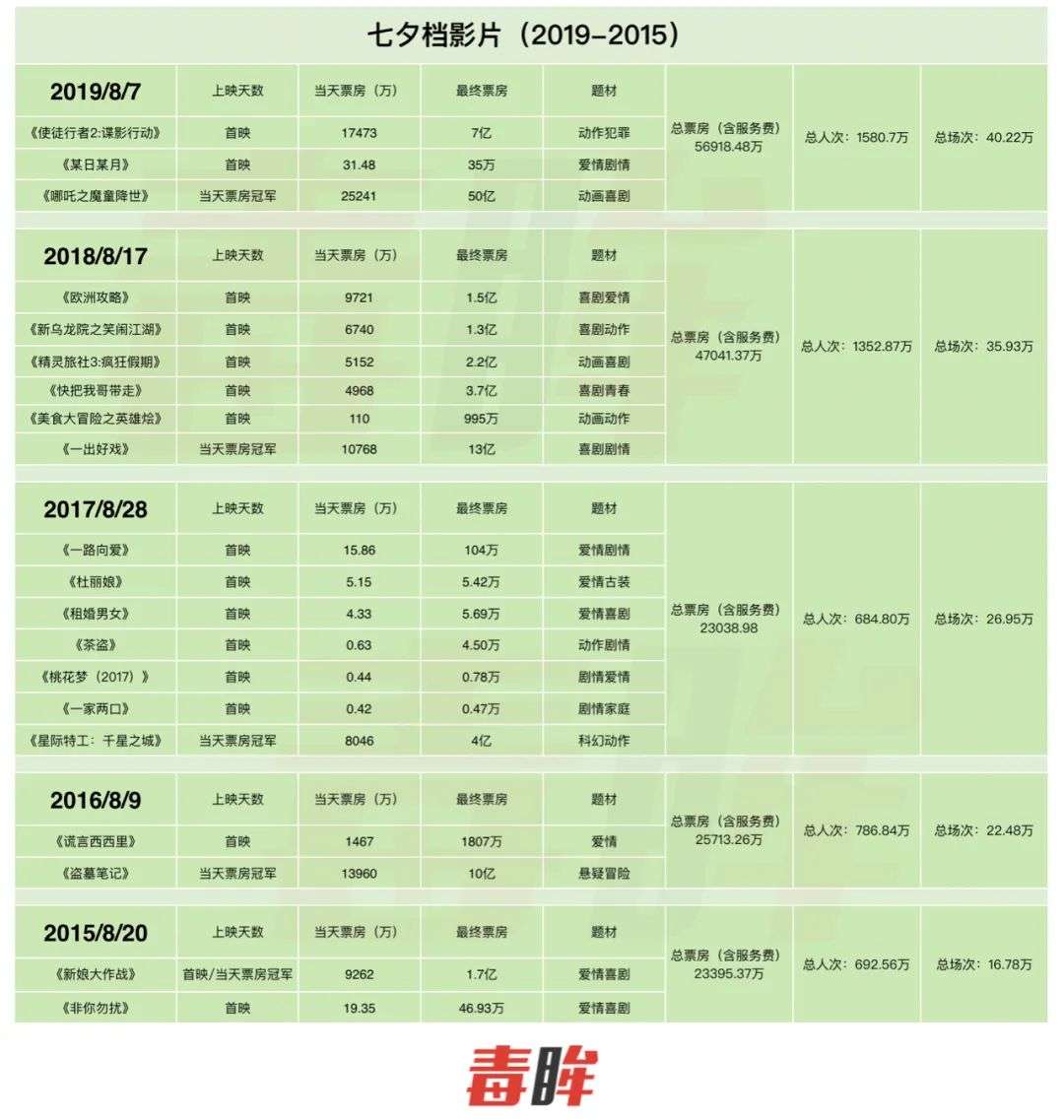 “七夕之前上映影片里还没有出现纯粹的爱情片,”一位业内人士向毒眸预测,七夕档6部影片基本都是新片,且定位准确瞄准许久没有看到爱情片的情侣和影迷们,因此具备一定市场潜力。