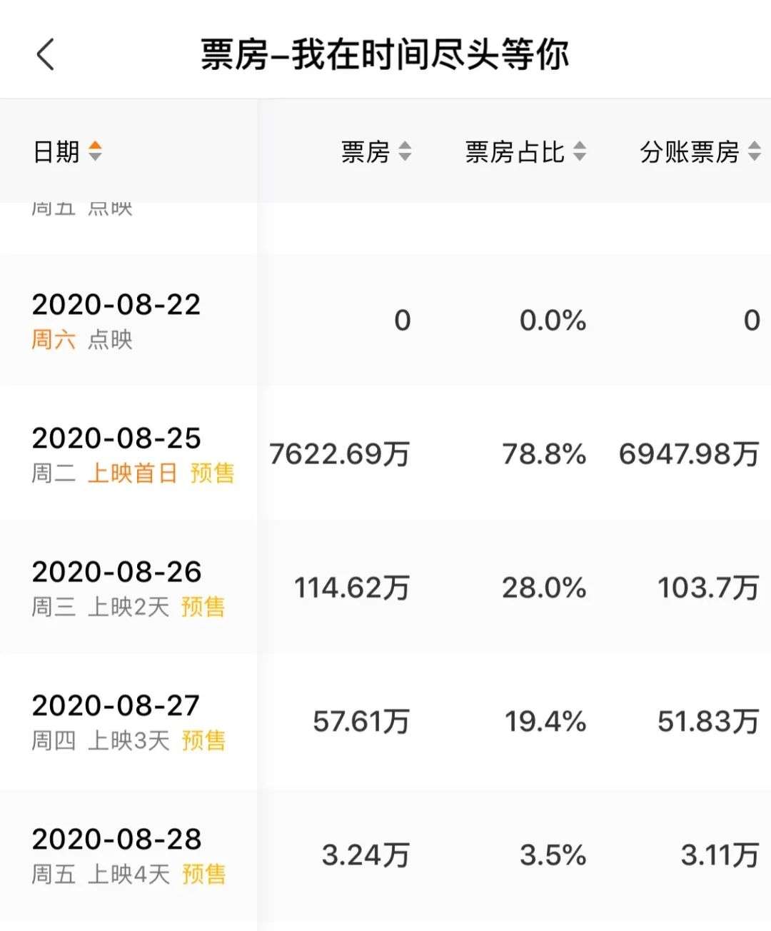 根据灯塔专业版显示,截至发稿日,《我在时间尽头等你》的想看指数871322人,8月25日的预售票房为8773万、目前占据当天票房的75.9%,排片占比则高达51.5%,高于《八佰》当天的24.3%的排片占比。
