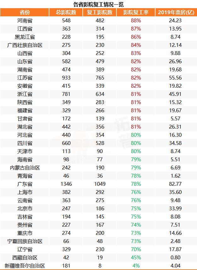 反而是北京、上海、广东等票仓省市的影院复工率相对较低,均不足80%,低于全国平均值。此前在毒眸的采访中,就有影院经理表示,大城市影院的复工成本比较高,碍于房租、工资等因素,影院背负的压力也会更大,在复工工作上会更为谨慎。