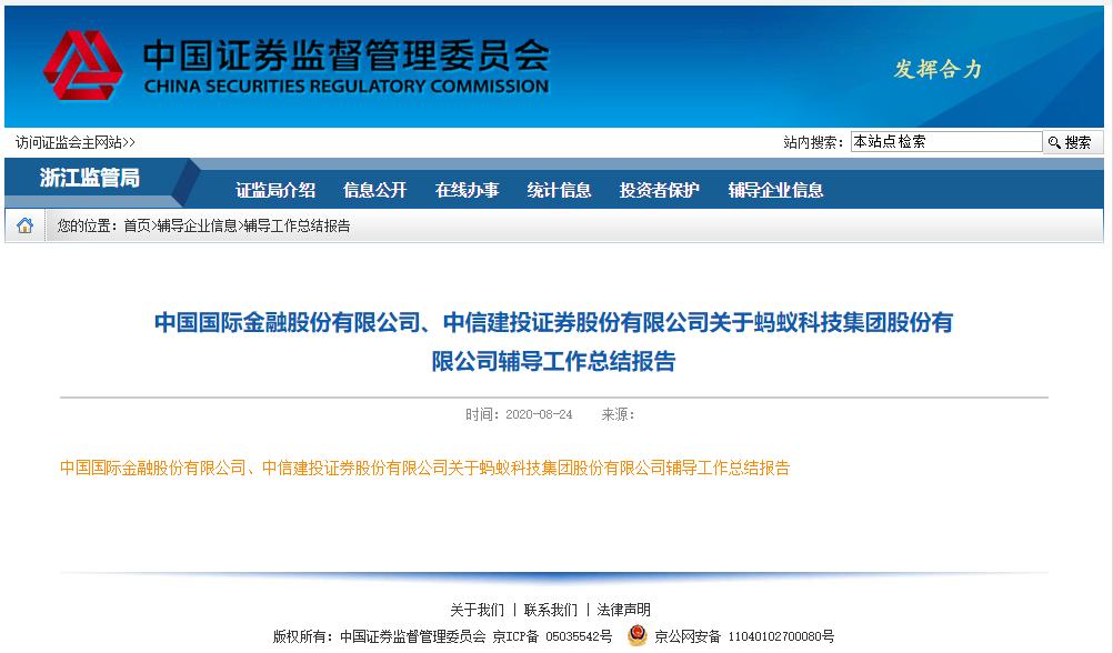 8月24日,证监会浙江监管局网站公示了蚂蚁集团辅导验收申请材料。材料显示,辅导机构中金及中信建投均已完成对蚂蚁集团的上市辅导,“蚂蚁集团各方面运行已经完善和规范,具备发行上市的基本条件。”