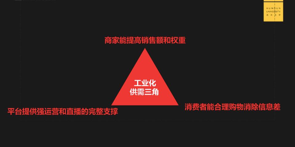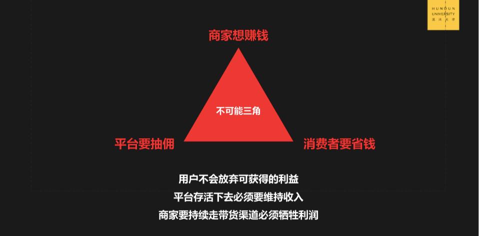 网红直播中,商家想要盈利会越来越难。我们看直播市场的三角,商家想赚钱,平台要抽佣,消费者要省钱。这其中要注意的是,用户不会放弃可获得的利益;平台存活下去必须要维持收入;商家要持续走带货渠道必须牺牲利润。