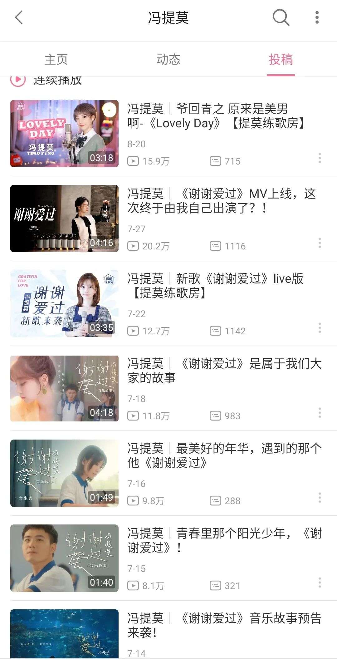 此后,除去常规的唱歌视频之外,冯提莫还尝试过宅家日记,开箱等视频内容。迄今为止在B站发布了52个视频,但整体视频播放量普遍在三十万上下,少有百万播放量视频。