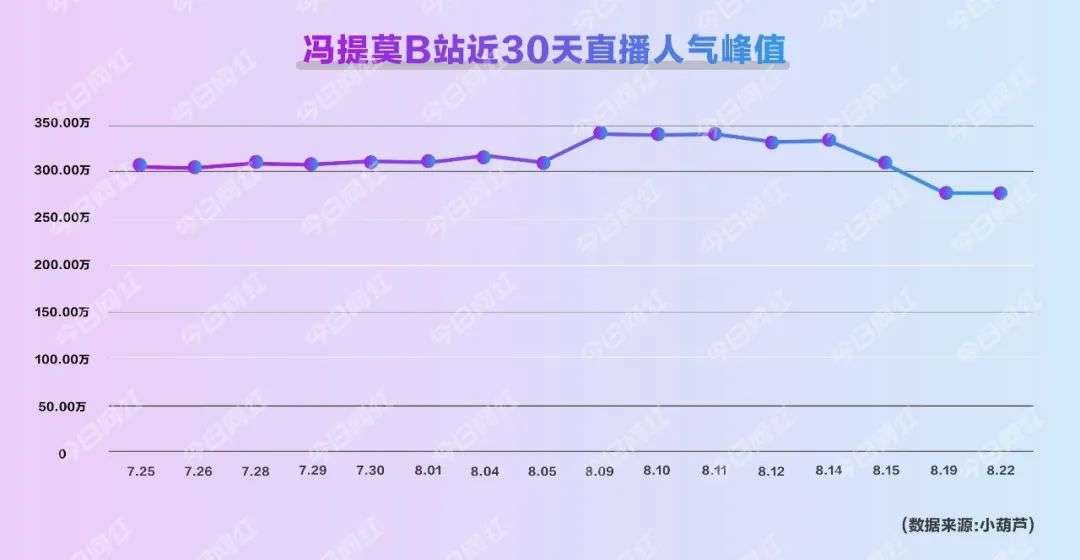据小葫芦统计,冯提莫B站人气近一个月最高人气344万,直播间活跃观众仅四千左右。