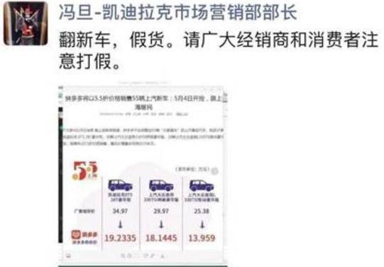 但与特斯拉一样,凯迪拉克也跟拼多多杠上了。凯迪拉克市场营销部部长冯旦,在其朋友圈中直斥拼多多卖的是“翻新车,假货”。同日,上汽凯迪拉克营销部发出官方声明称,拼多多活动并非车企官方行为、车辆来源不明、不提供售后原厂质保、并禁止经销商参与一切虚假宣传和不实报道。
