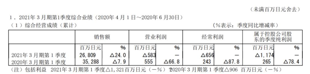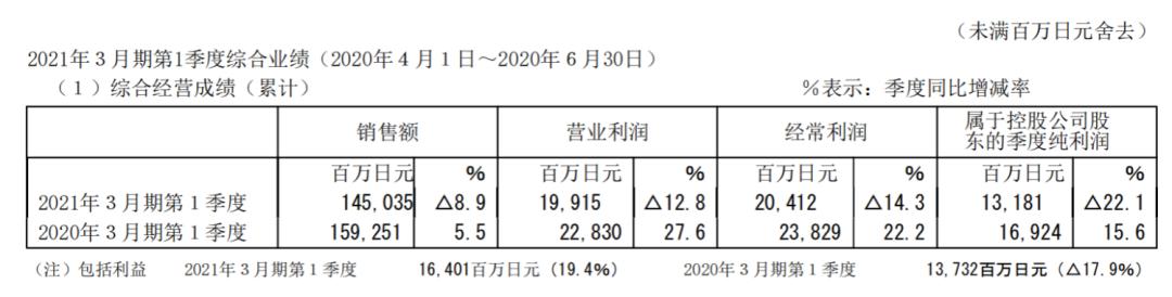 第一季度销售额为1450亿3500万日元,同比下降8.9%;营业利润为199亿1500万日元,同比下降12.8%;经常利润为204亿1200万日元,同比下降14.3%。