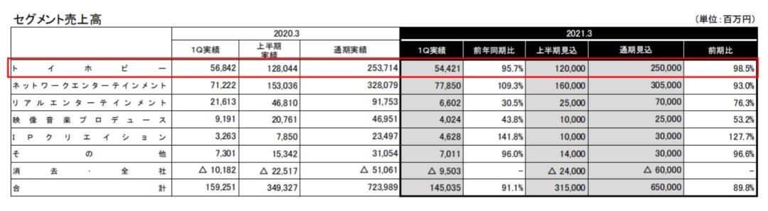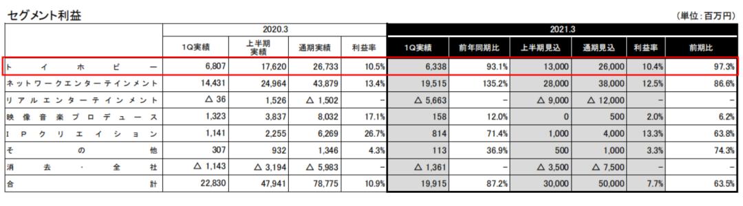2020年8月11日,万代对外公布了2021年3月期第一季度(2020.4.1-2020.6.30)决算数据。综合经营成绩如下: