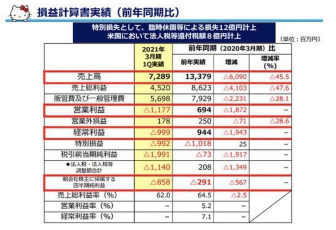 决算结果显示,第一季度销售额为72亿8900万日元,同比下降45.5%;营业损失11亿7700万日元,而去年同期盈利6亿日元;经常损失9亿日元,去年同期经常盈利9亿日元。因为主题公园的临时休园造成的特别损失达12亿日元。