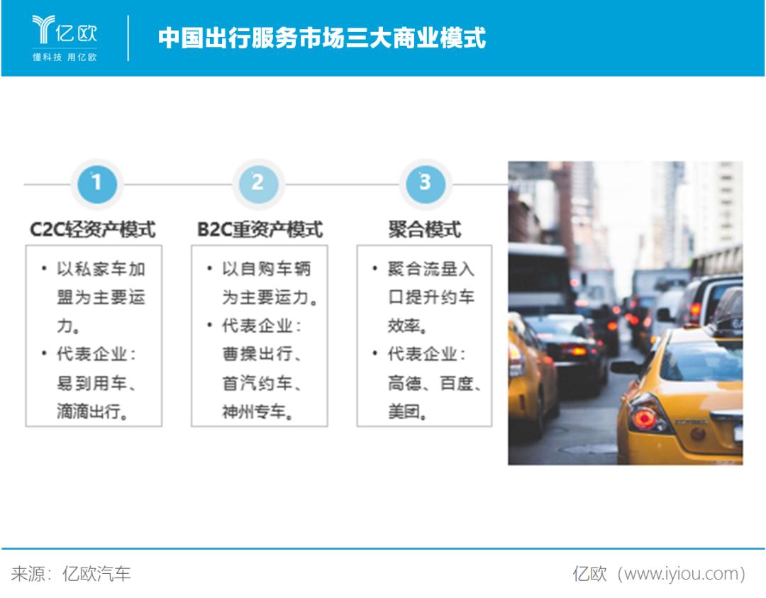 截至目前,在中国出行服务市场中,通常存在着三类商业模式企业:C2C轻资产模式、B2C重资产模式以及聚合模式。